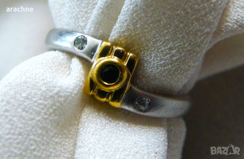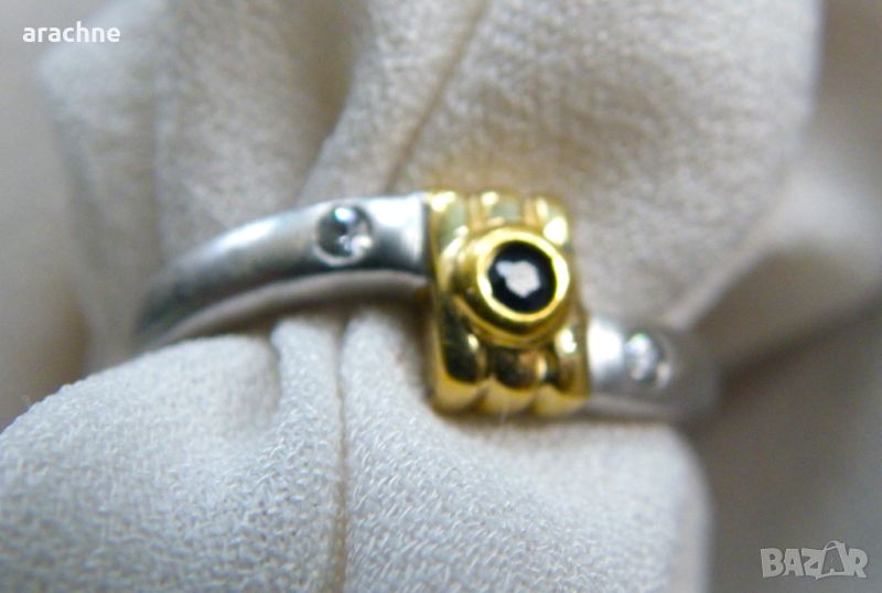 Сребърен пръстен с позлата,природен сапфир и топази → Обява 45671351