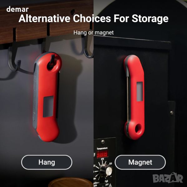 ThermoMaven F1 Turbo, сертифициран от NIST термометър, осигурява бързи и точни показания в рамките на ±0,5°F (±0,3°C) за по-малко от секунда, осигурявайки прецизно готвене. Той предлага двойни опции за съхранение с кука и магнит за удобство и е водоустойчив с рейтинг IP67, тестван в над 10 000 лабораторни изпитания за здравина. Допълнителните удобни за потребителя функции включват функция повдигане за събуждане, по-ярка подсветка за условия на слаба светлина и дисплей с автоматично завъртане, който се адаптира към потребители с дясна или лява ръка.