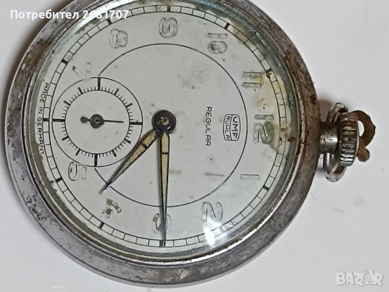 Много стар рядко срещан джобен часовник UMF/RUHLA - REGULAR. Made in Germany. Целият механизъм е жълт.