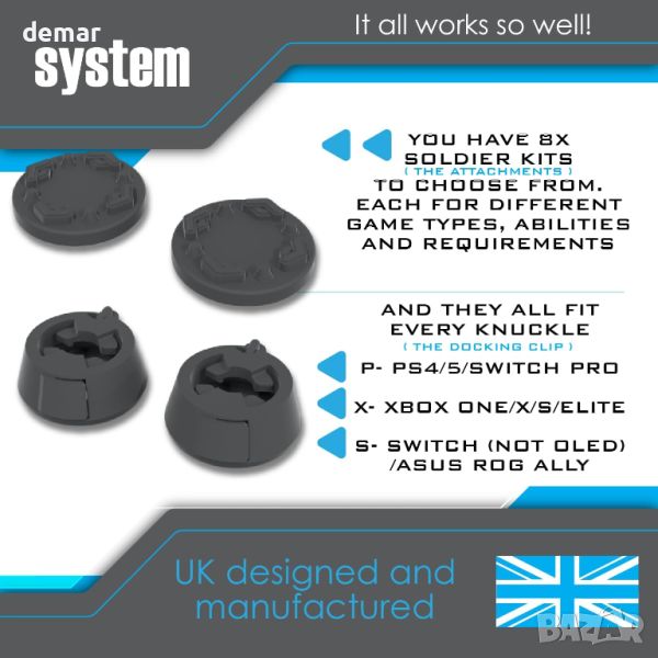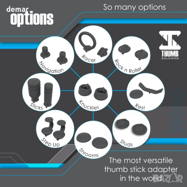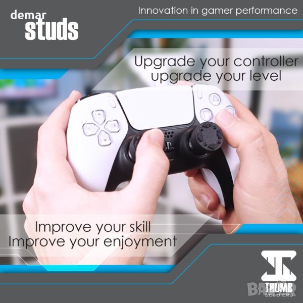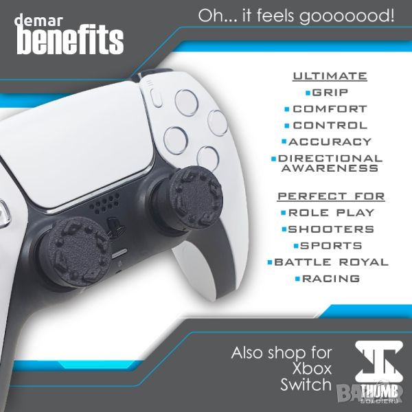 Геймърските ръкохватки Thumb Soldiers осигуряват интуитивно усещане с допълнителен захват на ръба, подобрявайки контрола чрез иновативни аксесоари за палци, предназначени за подобрена производителност при игри. Те са сигурни, но лесни за поставяне, като гарантират, че няма да паднат дори по време на интензивна игра. Съвместими както с PlayStation 4, така и с PlayStation 5 контролери, тези ръкохватки са задължително допълнение към всяка игра. Те предлагат допълнителен комфорт, като изискват по-малко сила, което помага за намаляване на умората в палеца, китката и ръката ви. Освен това тези ръкохватки предпазват палците на вашия контролер от износване, без да причиняват щети.