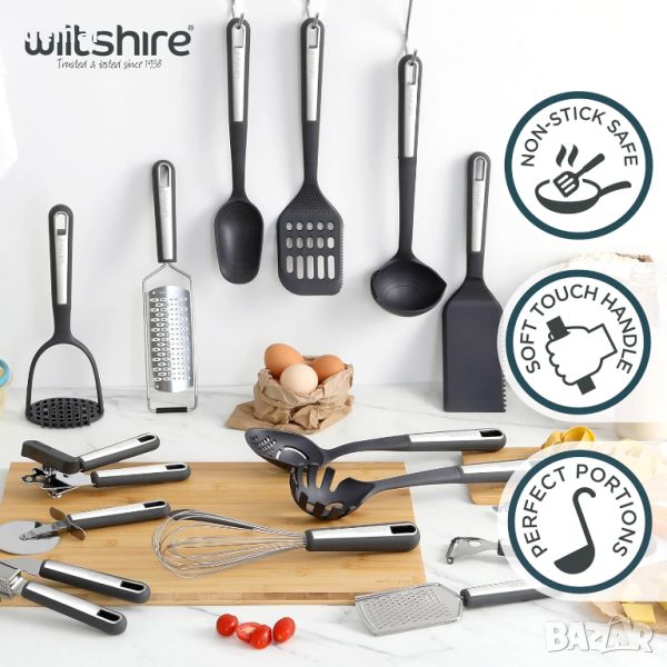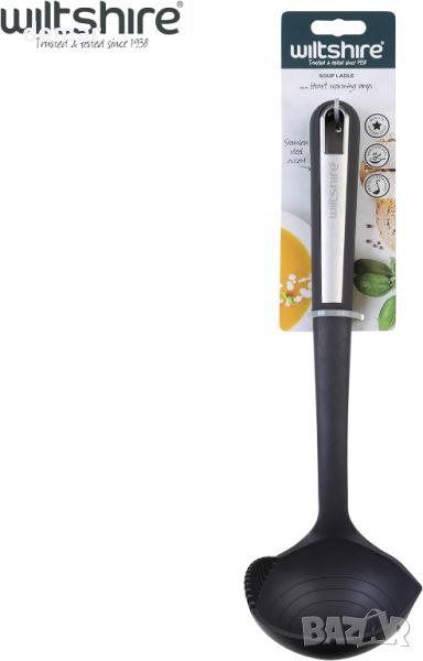 Черпакът за супа Wiltshire Aspire е изработен с незалепваща, топлоустойчива глава (до 200°C), идеална за разбъркване и сервиране на обилни супи, без да надраскате съдовете си. Разполага с неплъзгаща се TPR дръжка с мека ръкохватка със стилна вложка от неръждаема стомана, осигуряваща удобно и сигурно боравене. За поддръжка се препоръчва измиване на ръцете и цялостно изсушаване, за да изглежда най-добре. Освен това включва проектиран отвор за лесно окачване и съхранение, като оптимизира кухненското пространство. Този черпак е с размери 33x10x7,5 cm, съчетаващ функционалност с елегантен сив и сребрист дизайн, за да допълни вашите кухненски прибори.