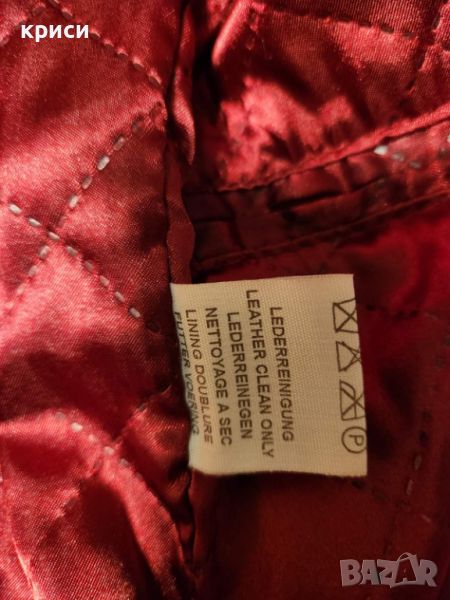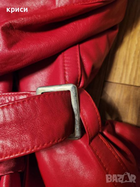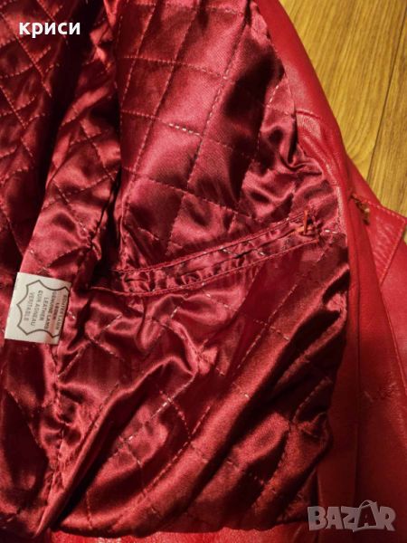 Дамско късо червено яке естесвена телешка кожа, размер 40 става и за М и за С.Дължина 53.5см., дължина на ръкава 60см., бюст едностранно 39см. Якето е с малки забележки при ръкава, яката и катарамата.