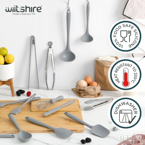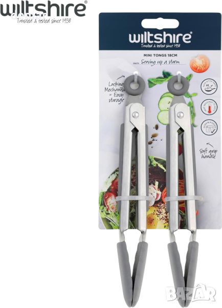 Мини силиконовите кухненски щипки Wiltshire, с размери 18 см и налични в комплект от две, са универсален инструмент за всяка кухня или сценарий за печене на скара. Тези щипки са изработени с незалепваща силиконова функционална глава, която е безопасна за използване върху съдове за готвене с покритие и може да издържа на температури до 220°C. Те разполагат с дръжка от неръждаема стомана с неплъзгаща се мека вложка, осигуряваща издръжливост и комфорт по време на употреба. Проектирани със заключващ механизъм за натискане и издърпване и отвор за окачване, тези щипки са лесни за съхранение и поддръжка. Подходящи за съдомиялна машина за удобство, могат да се мият и на ръка за допълнителен блясък. Перфектни за задачи като печене на царевица, обръщане на бургери, сервиране на печено месо, салата, паста и други, тези мини щипки в сиво като камъче са важен топлоустойчив прибор за готвене както на закрито, така и на открито.