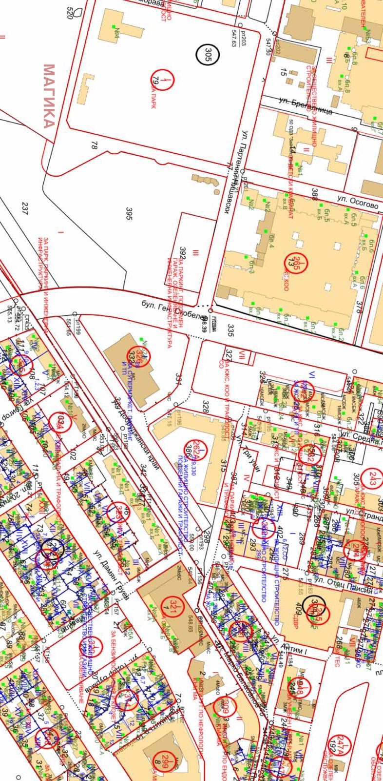 УПИ VII-327, кв 242, м. Зона Б-5-3 , район Възраждане , от плана на гр. София, с предназначение за КЖС, КОО, ПГ и ТП е отреден за 68134.304.327, частна собственост, урбанизирана територия с НТП за друг вид застрояване в обхвата на КК и КР одобрени със Заповед РД-18-32/01.04.2016 г. на изпълнителния директор на АГКК, съгласно ОУП на СО попада устройствена зона Ц1 зона на новия делови център. Устройствените параметри за зона Ц1 ограничаващи и определящи застрояването се определят с ПУП и РУП. КИНТ без ограничение.