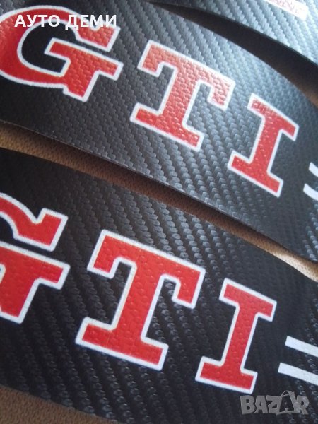 Стикер за задна броня на цена 14 лв за размер 90 см на 6.8 см с надпис GTI и 16 лв със светлоотразителни букви с гланцова повърхност.