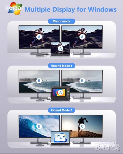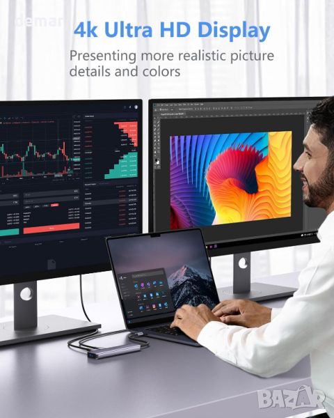 Този двоен HDMI адаптер е проектиран за ефективност и преносимост, включващ два HDMI порта, поддържащи 4K@30Hz за изживяване с висока разделителна способност, три USB 3.0 порта за бърз трансфер на данни до 5Gbps и USB-C порт с PD 100W за бързо зареждане . Той е plug-and-play, не изисква драйвери и е съвместим с повечето лаптопи тип C с Thunderbolt 3, включително различни модели от Apple, Samsung, Dell, Lenovo, HP и други. Адаптерът е изработен от издръжлива, устойчива на износване алуминиева сплав, осигуряваща добро разсейване на топлината и лека, компактна конструкция, идеална както за офис употреба, така и за пътуване. Забележка: В MacOS външните дисплеи ще отразяват същия изход.