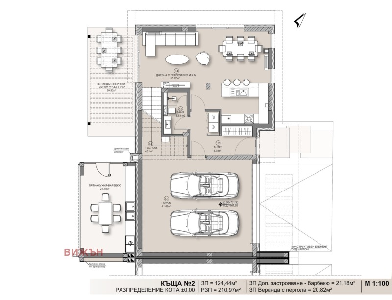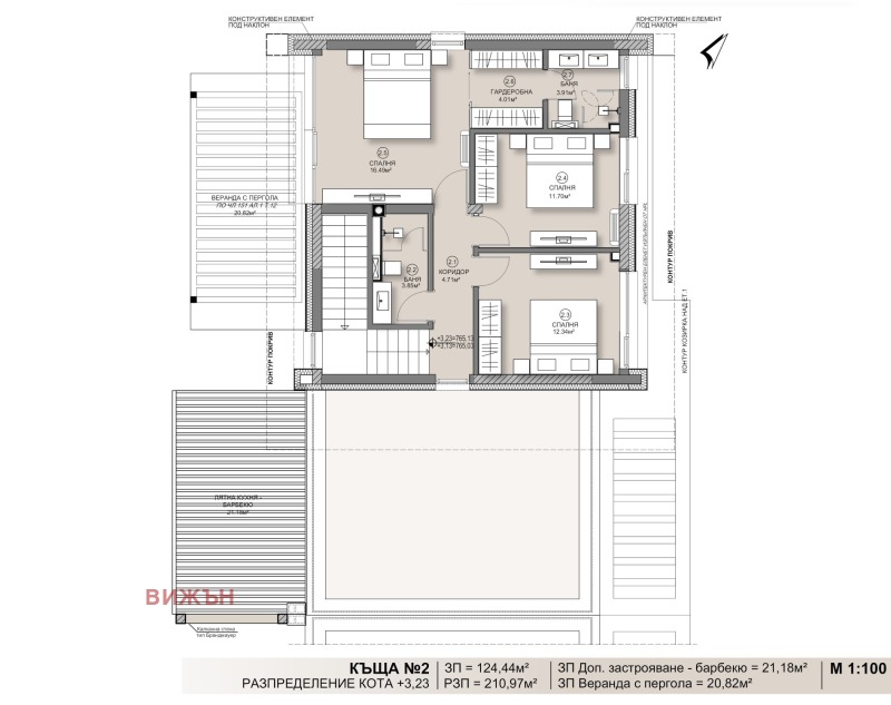 Агенция Вижън ви предлага ексклузивно жилищен комплекс Витоша Вю, състоящ се от 7 самостоятелни къщи със самостоятелни дворове и съвременна архитектура, осигуряващи естествена, чиста и сигурна среда на живот в покрайнините на София. Проектът от 7 къщи е разположен на удобна и предпочитана за живеене локация в полите на Витоша в началото на с. Рударци, като умело съчетава характеристиките на къща сред природа, чист въздух и спокойствие. Разпределение къща 2: Първи етаж; дневна с кухненски бокс, антре, баня с тоалетна, мокро помещение, техническо помещение (под стълбищната клетка) и гараж с топла връзка; Втори етаж; три спални, две бани с тоалетни, гардеробно и голяма покривна тераса с площ от 41,68 кв.м над гаража. Дограмата е висок клас на РЕХАУ с троен стъклопакет, цвят антрацит с обков Масо, като във всекидневната механизмите са с паралелно плъзгане тип Фолксваген. Всички стъклени конструкции са с френски прозорци и обхващат пространството от пода до тавана, които осигуряват изобилие от естествена светлина. Отопление и охлаждане: под замазката ще бъде изградена инсталация за подово отопление, а за всяка стая за охлаждане ще бъде изградена и инсталация за конвектори, като по проект е предвидено да бъде захранвано от термопомпа. Входната врата ще е висок клас с висока степен на топлоизолация, прекъснат термомост за да не създава конденс и оборудвана с пет точкова секретна брава за максимална сигурност. БОНУС ПОКРИВНА ТЕРАСА - Всяка една от къщите е с гараж, като пространството над гаража ще бъде използвано като покривна тераса с достъп от вторият етаж на всяка къща и не влиза в общото рзп на имота. Всяка къща ще бъде захранена от 30 kw трифазен ток, като във всеки един гараж ще бъде изградена станция за зареждане на електромобил. Външната фасада ще бъде съчетание от еталбонд, hpl, фибробетон и силиконова мазилка. Покривът ще е от плосък тип завършен с висок клас топло и хидроизолационни материали с 10 години гаранция. Отделно към всяка една от къщите има проект за барбекю, което при желание може да бъде изградено от новият собственик. На три от къщите ще има проект за басейн, който също при желание може да бъде или да не бъде изграждан. Външният периметър на комплекса ще бъде ограден със зид с височина от 2,20м. Входа на комплекса е от ул. Черни връх, като в близост има денонощен магазин, баничарница и ресторант. Стартът на строителството е през май 2024 г. Работим с колеги по всички наши оферти! Пълна информация за проекта може да намерите на нашият сайт - https://vision-estates.com/imoti/orhideya-park/vitosha-view/