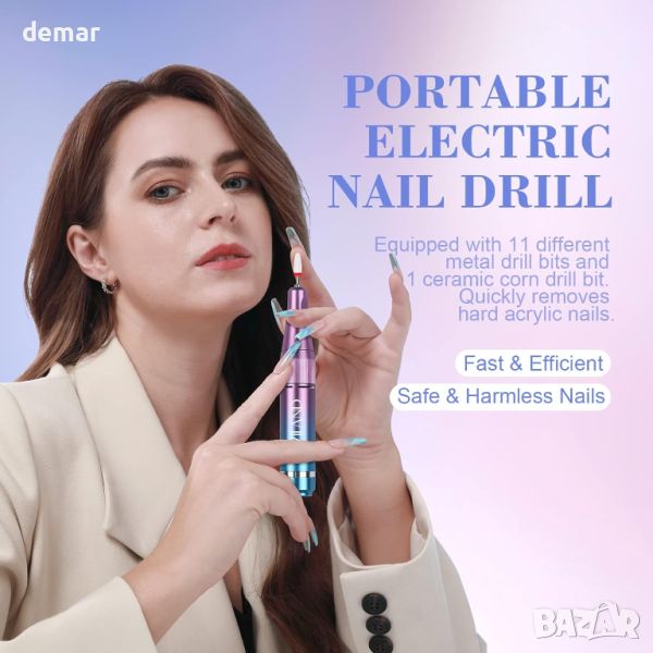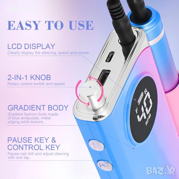 Комплектът електрическа пила за нокти Saviland е предназначен както за професионална, така и за домашна употреба, включващ мощен мотор с регулируеми скорости до 40 000 RPM за ефективно справяне с различни задачи за маникюр, включително премахване на гел, акрил и прахообразно премахване на нокти. Предлага се снабден с 11 метални накрайника, 1 керамичен накрайник и 56 шлифовъчни ленти, подходящи за премахване на кожички, мъртва кожа и мазоли. Тази пила е изработена от висококачествени материали с поразителен градиентен розов и син дизайн, предлагащ нисък шум, вибрации и топлина за комфортно потребителско изживяване. Освен това е преносим, с акумулаторна батерия от 2600 mAh, която осигурява 10-12 часа работа и поддържа зареждане тип C. LCD екранът показва настройките и състоянието на захранването, подобрявайки лекотата на използване с просто копче за управление и бутони за незабавна пауза и регулиране на посоката.