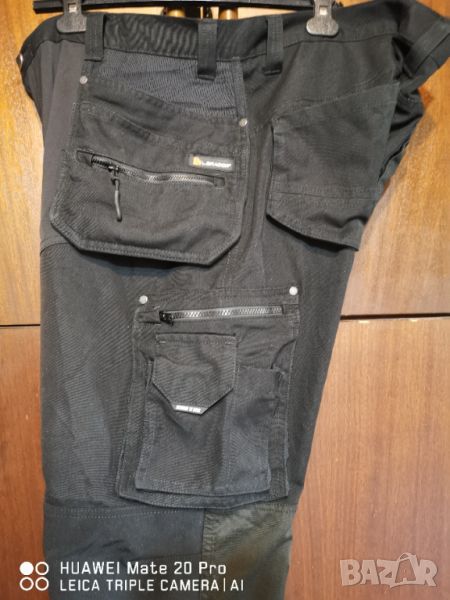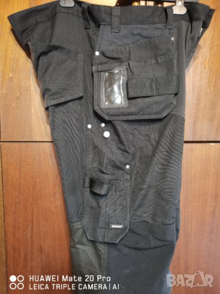 Страхотен модел. Плат с еластичен плат в неудобните зони. Талия 110 см. Дължина 110 см. 18 работни джоба + 2 джоба за наколенки. Черен цвят без забележки. Без петна, без изхбяване. Усилени колене, здрав плътен плат, плюс еластичен плат. Страхотен работен панталон. С проветрители между бедрата.