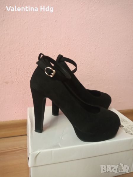 Дамски черни обувки на платформа с каишка около глезена.36 номер са,но по-скоро отговарят на 35.Не уцелих размера.Обух ги веднъж,но не са моят номер.Иначе са удобни,не се усеща височината,но ми стягат.