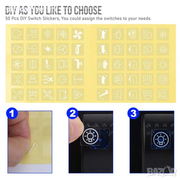 Включва 4 превключвателя за включване и изключване със син светодиод.