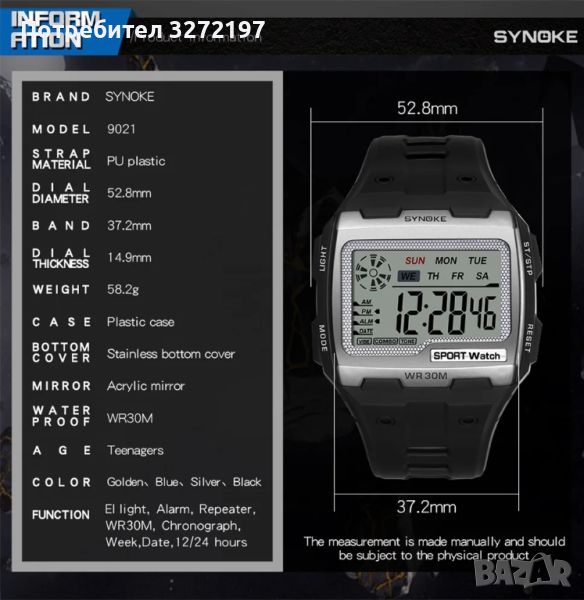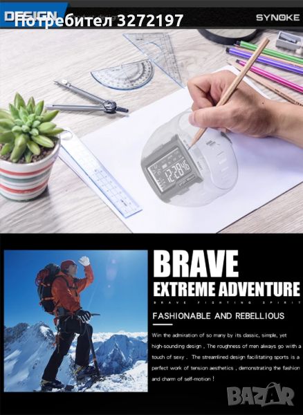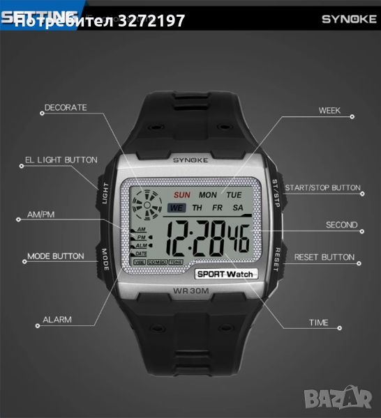 часовник SYNOKE PANARS голям квадратен циферблат,аларма,хронограф и др.
