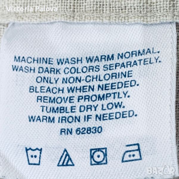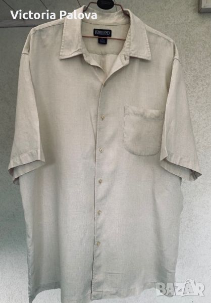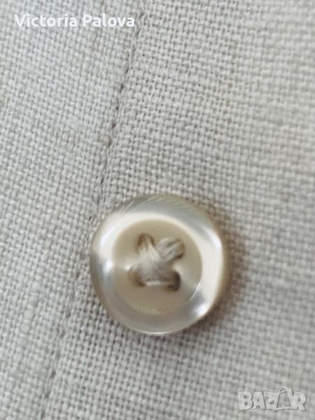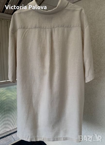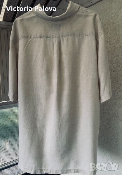 Прекрасна голяма риза от качествен гладък лен, седефени копчета. Рамо - 56см, ГО - 74см, дължина отпред - 82см, отзад - 87см, ръкав - 30см, цепки отстрани -7см.