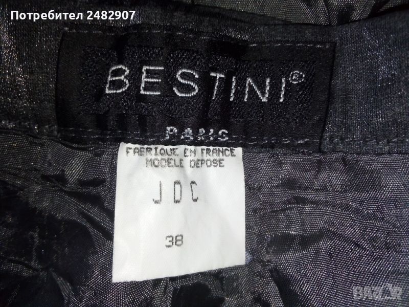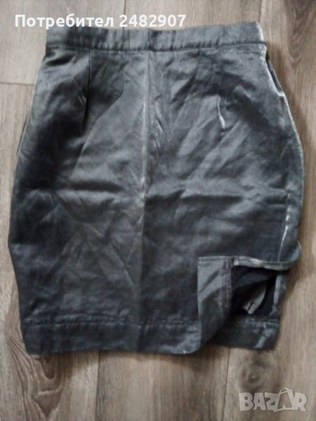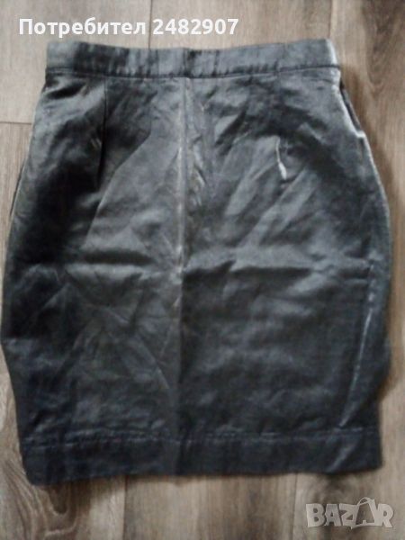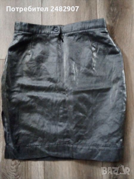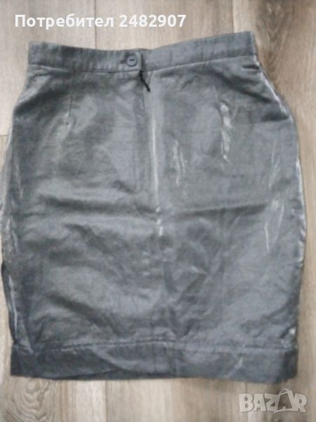Елегантна дамска пола със сребрист металически ефект, размер 38. Съдържа 85 % вълна и 15 % полиестер. Ширина в талията - 32 см, ширина в долната част - 40 см, дължина от талията до долу - 46,5 см. Много запазена, обличана веднъж за повод, закопчаване - с копче и скрит английски цип отзад, с подплата и странична цепка в ляво (дълга 17 см).