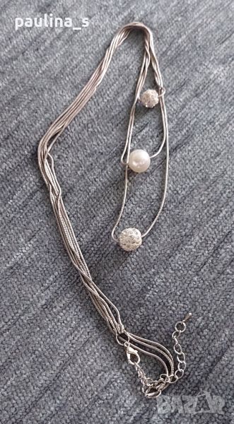 Изключително стилен и ефектен триреден гердан с перла и топки с камъни тип Сваровски, в сребристо, родиран срещу потъмняване.