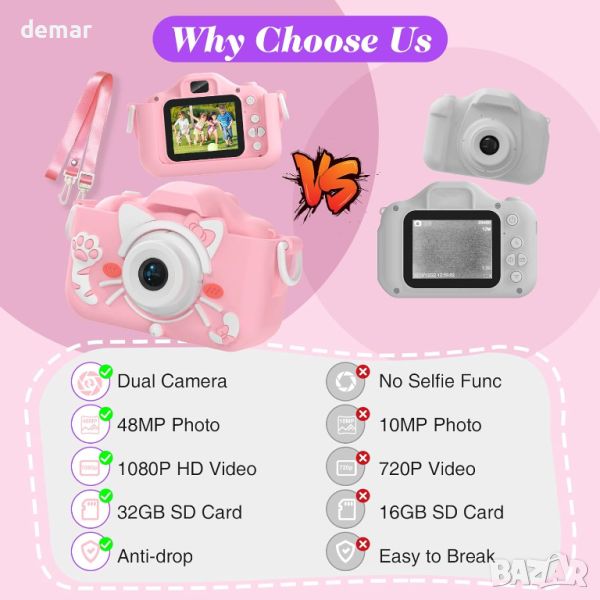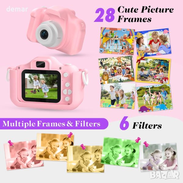 Тази издръжлива детска камера е предназначена за деца на възраст 3-8 години, включваща 12-мегапикселова 1080P основна камера и 720P селфи камера, плюс 28 забавни кадъра, 10 специални ефекта и 6 филтъра за подобряване на креативността. Той идва с 32GB карта за съхранение, способна да съхранява над 35 000 снимки, и USB-C кабел за лесно прехвърляне на снимки към компютри. Камерата е обвита в безопасен, нетоксичен силиконов капак, който я предпазва от изпускане, и включва ремък за пренасяне. Зарежда се само за 1,5 часа за 4-6 часа употреба, освен това има вграден MP3 плейър и пет образователни игри за забавление и обучение на децата, което го прави перфектен инструмент за тях да изследват и заснемат света около себе си независимо.