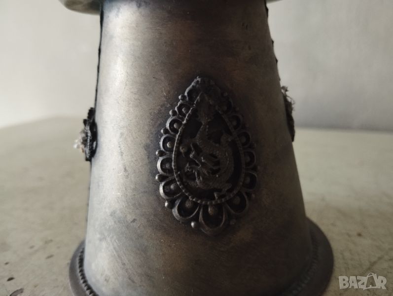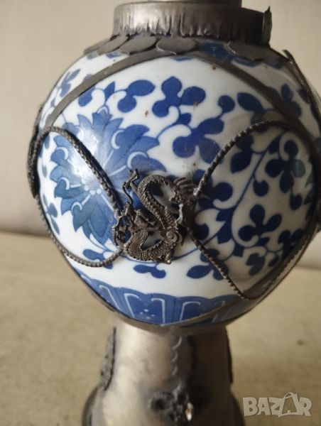 Порцелан в посребрени метални оплетки,ръчна изработка.Работи(липсва фитил)