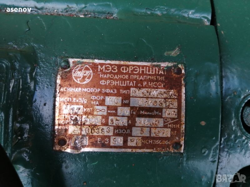 Продавам електрически двигател с мощност 17 киловата, 1450 оборота в минута, взривозащитен, херметично затворен, диаметър на ос 42 мм