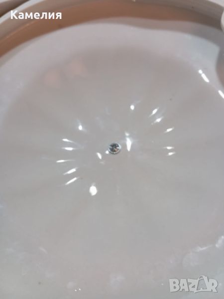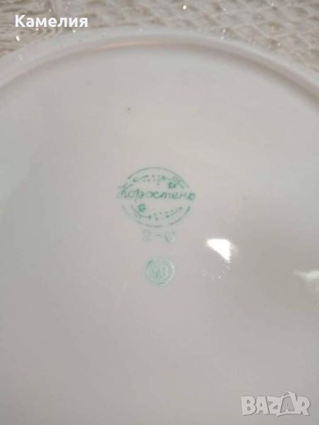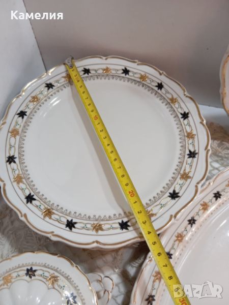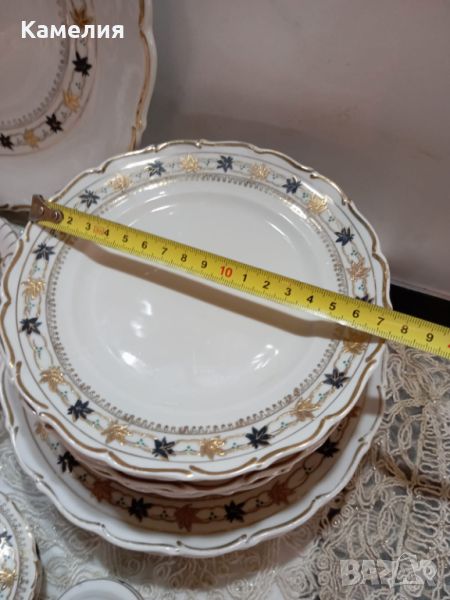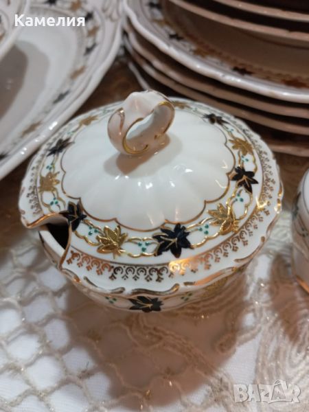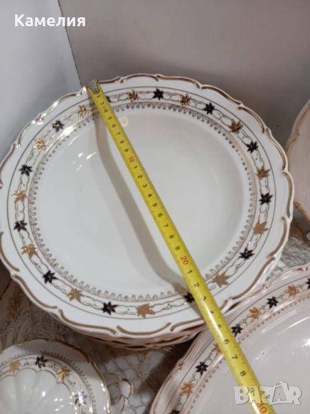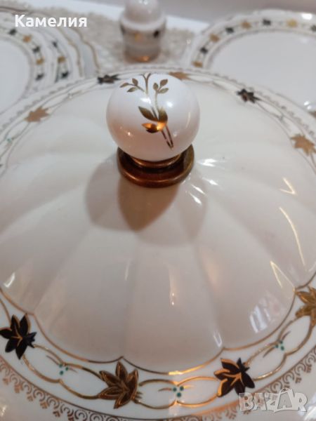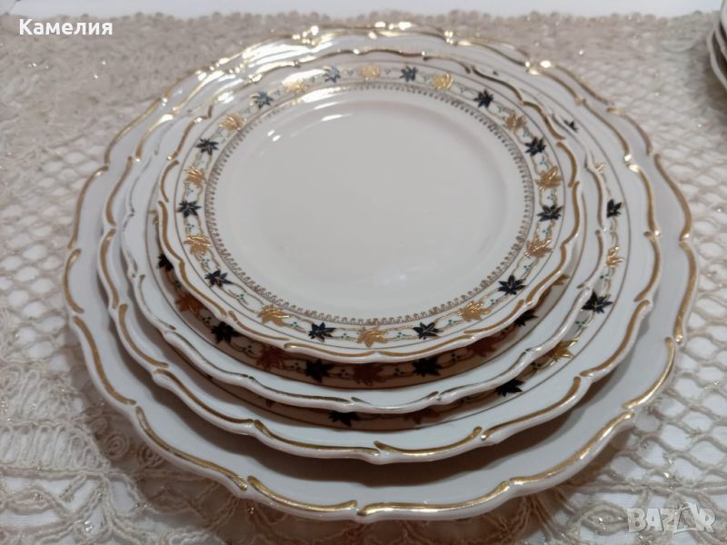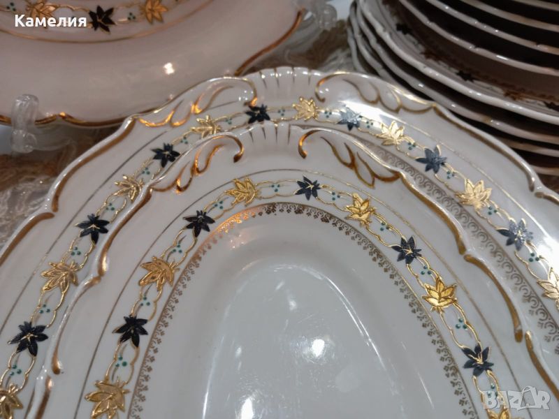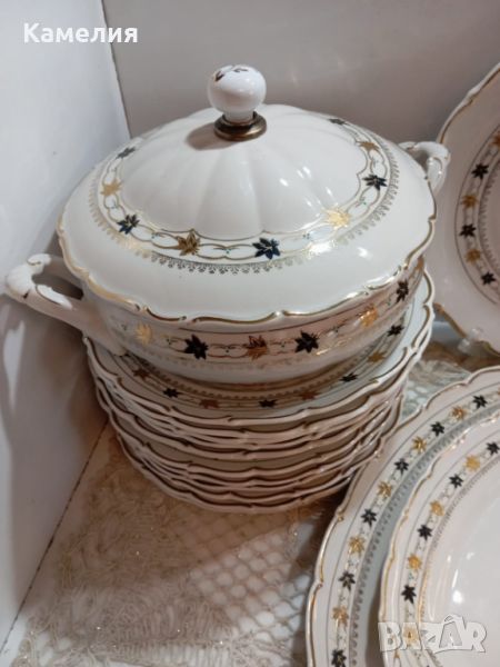 порцелан. Супник, 2 броя съдче с капак, голямо овално плато , малко овално плато, кръгло плато , солница, 6 броя чинии за основно 24 см, 5 чинии за супа, 4 чинии за предьясти, 6 десертни чинии. Забележки: една чиния за супа и една десертна чиния с пукнатини и дръжка на капак на супника реставрирана ( последни снимки).