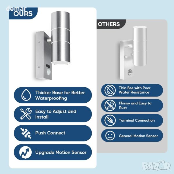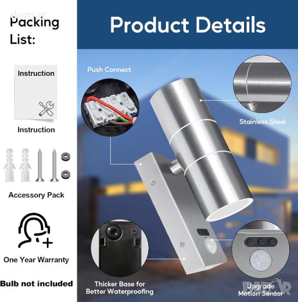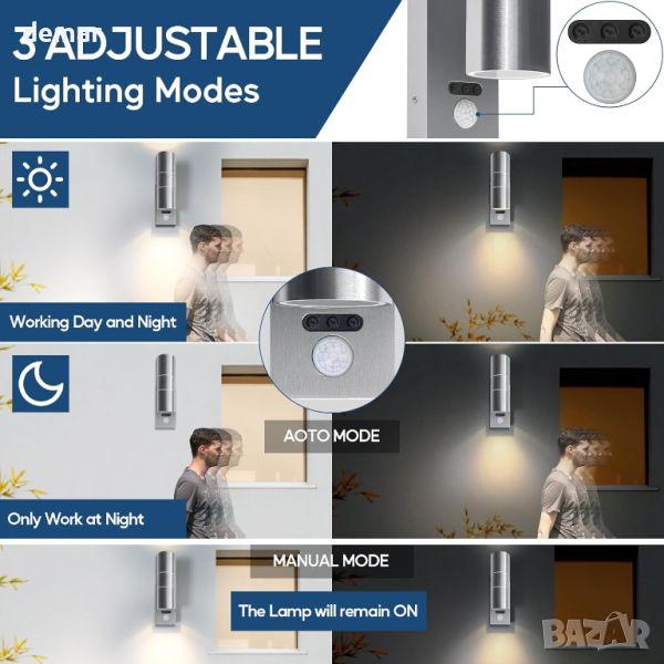 Намалете разходите си за електроенергия и подобрете безопасността с това елегантно осветление за вила, включващо сензор за движение. Сензорът е регулируем, което ви позволява да зададете продължителност (5 секунди до 10 минути) и режим на работа (денонощен или нощен). Неговият стилен дизайн включва фенери за измиване на стена както с по-висока, така и с по-ниска светлина, идеални за събирания на открито. Инсталирането е опростено със система от пуш конектори, като се избягват традиционните проблеми с окабеляването. Осветителното тяло е съвместимо с LED крушки с цокъл GU10 до 35 W (не са включени) и може да се похвали с водоустойчив рейтинг IP65, гарантиращ издръжливост със своя висококачествен, устойчив на ръжда алуминиев корпус.