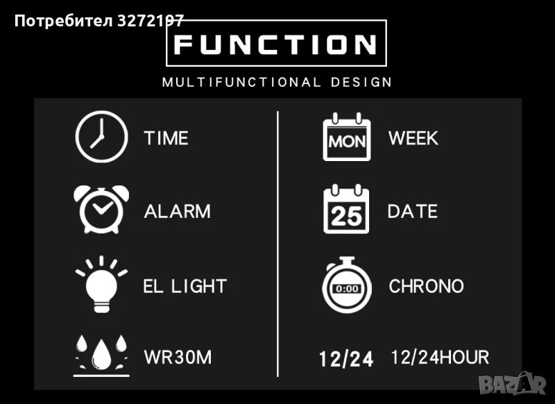 Светлинна, аларма, почасова, WR30M, текущи секунди, ден от седмицата, 12 / 24 часа