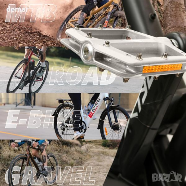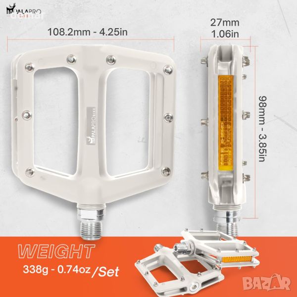 Тези педали за велосипеди с висока видимост са проектирани за безопасност и видимост при условия на слаба светлина, включващи здрави, но леки тела от найлонови влакна и отразяващи страни. Всеки педал тежи 180 g и включва високоскоростни запечатани лагери за намалено триене и подобрена ефективност при въртене на педалите. Педалите предлагат отлично сцепление с 8 неплъзгащи се щифта от неръждаема стомана от всяка страна и отворен дизайн, който предотвратява натрупването на кал. Те са водоустойчиви, устойчиви на износване и корозия и имат широка платформа (98 mm x 108 mm, дебелина 20 mm) за повишена стабилност и комфорт. Съвместими със стандартна 9/16-инчова ос, тези педали са лесни за инсталиране и подходящи за различни велосипеди, включително MTB, шосейни велосипеди, BMX, електрически велосипеди и градски велосипеди. (L отляво и R отдясно)