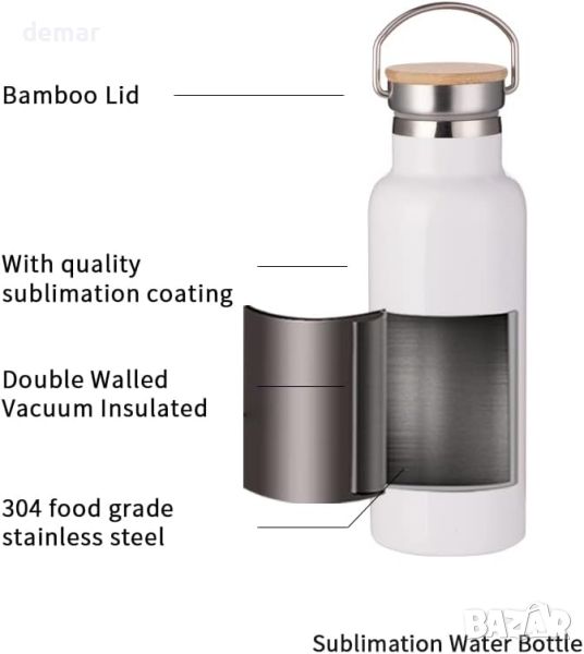 Бутилката за вода за сублимация от 17 унции (500 ml) е изработена с висококачествено сублимационно покритие, което осигурява живи и ясни резултати при печат с помощта на машина за топлинно пресоване на чаша или сублимационна фурна. Всяка бутилка се предлага индивидуално опакована и се продава в комплекти от четири в кафява подаръчна кутия, което я прави готова за подарък. Изработен от неръждаема стомана 18/8 304 с двойни стени, той поддържа напитките топли или студени с часове. Дизайнът включва бамбуков капак и преносима дръжка, което го прави идеален за употреба в офиса, дома, дейности на открито като къмпинг и туризъм, или като персонализиран подарък за приятели, семейство или корпоративни подаръци.