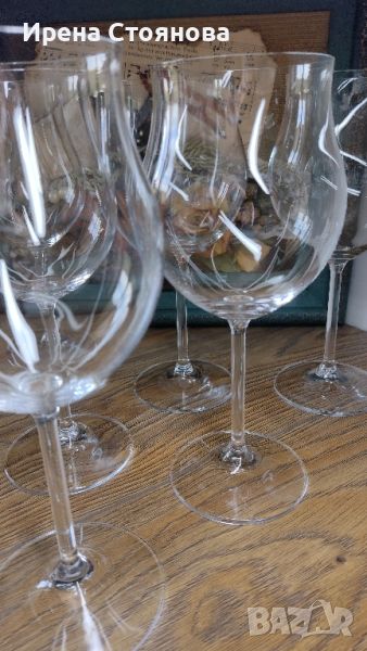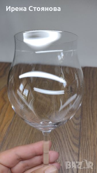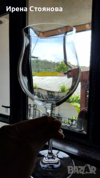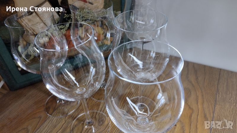 Големи чаши за вино, кристалин. Вместимост 550 ми, височина 22 см и диаметър 7,5 см. Форма на лале, дълъг и чист звук. Възможни на места, незабележими следи от съхранение. Цена 60 лв.