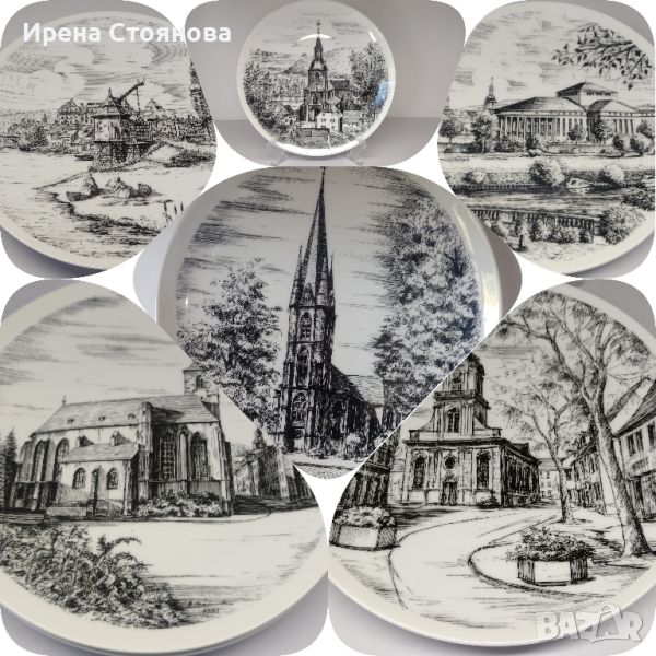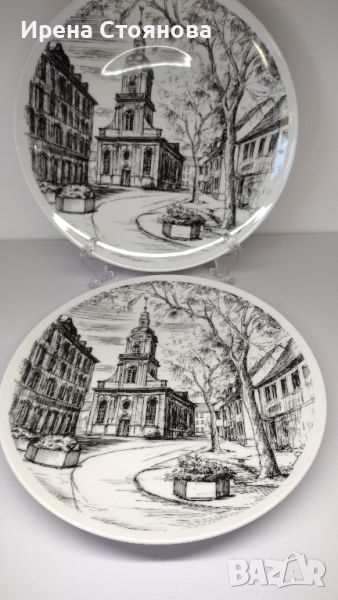Декоративни чинни за окачване на стена. В черно-бяла гама с различни емблематични, исторически паметници и сгради в Saarbrücken, Germany. Диаметър 24,5 см. Малка забележка на на ръба, вижда се под ъгъл. Цена 20 лв.