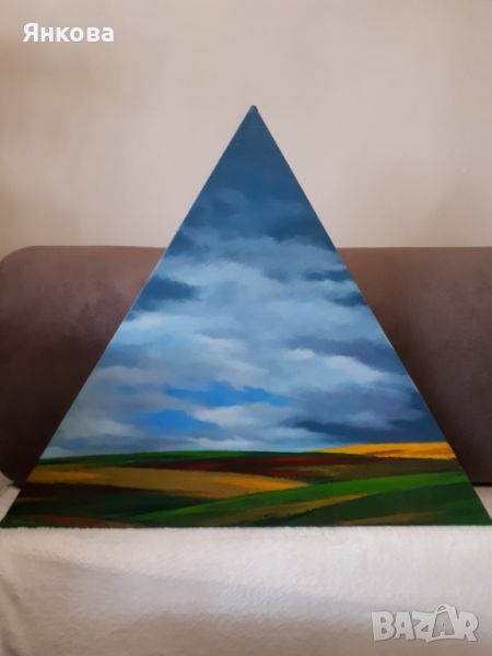 Интересна картина с триъгълна форма, с размери: основа 56см.и страни по 53см.С подпис на автора.