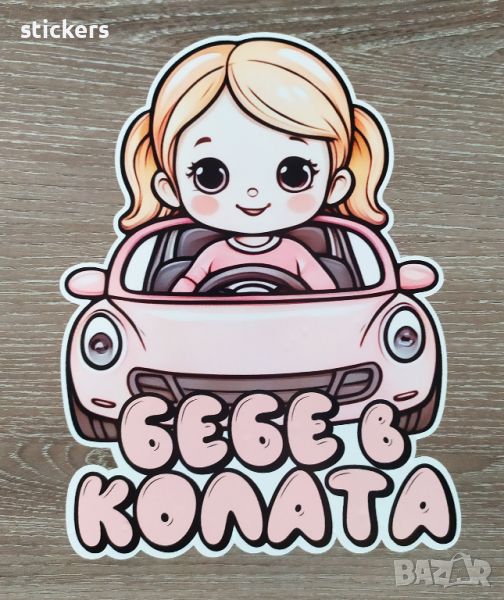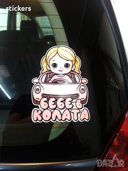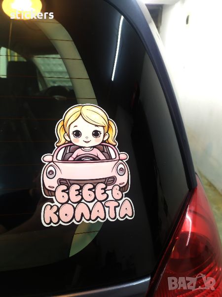 Стикер бебе в колата. Размера е 12х16см. за външно лепене. Изработен от качествено ПВЦ фолио което издържа на УВ лъчи и вода/намокряне.
