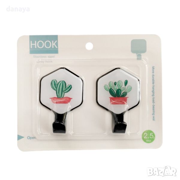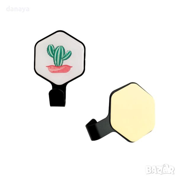 Комплект от 2 броя лепящи закачалки с принт на кактуси. Красиви и цветни. Всяка закачалка има една кука за закачане на кухненски кърпи, прибори или други аксесоари. Лесен монтаж – просто залепете върху гладка повърхност и готово! Идеални са за кухня или баня. Издържат на натоварване до 2.5 кг. Изработени от метал.