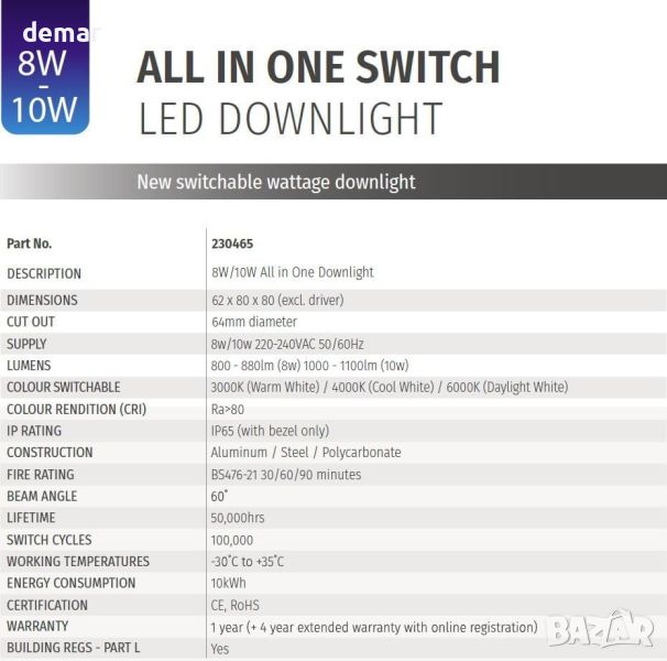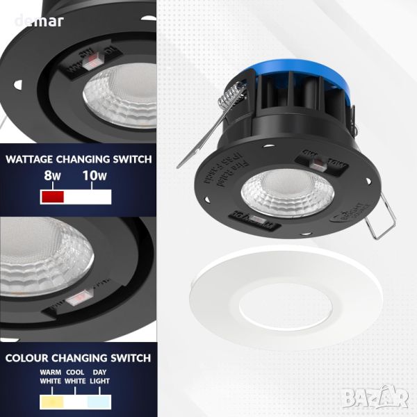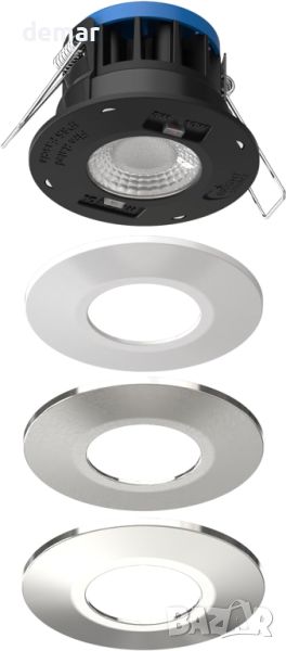 Тази надолу лампа от поколението All-in-One предлага персонализирано осветление с възможност за превключване между топло, студено или дневна бяла светлина и регулиране на мощността между 8 W и 10 W. Той разполага със сменяеми рамки, пълна защита IP65 и степен на пожар до BS476-21 за 30/60/90 минути. Устройството е изработено от издръжлив алуминий, стомана и поликарбонат, включва подвижен изолационен капак и осигурява лесна инсталация с конектор GST18 и включен LED драйвер, което го прави идеален за тесни пространства и енергийно ефективно осветление във всяка обстановка.