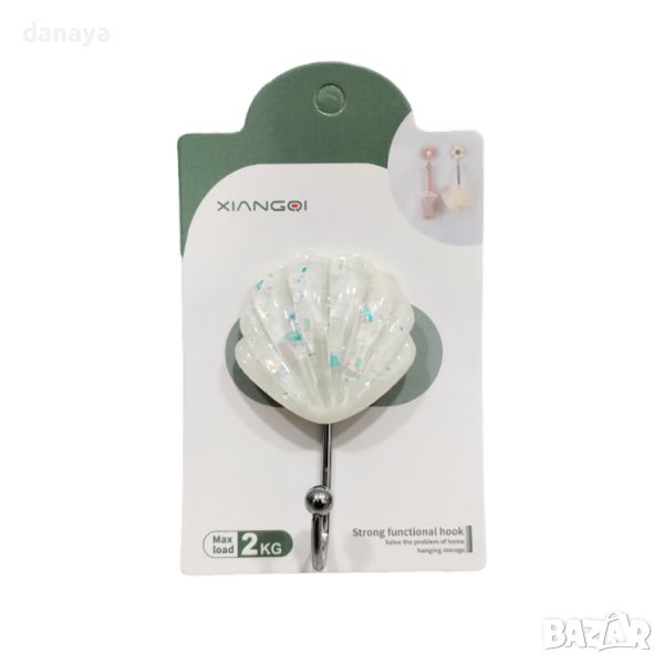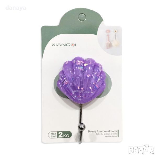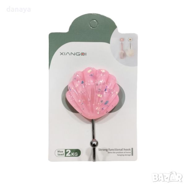 Изящна самозалепваща закачалка за кърпи или други прибори и аксесоари. Може да я залепиш в банята, в кухнята или друго помещение. Лепи се върху гладка повърхност. Тази закачалка се отличава с това, че е декорирана с голяма и красива морска мида. Избери своя цвят!