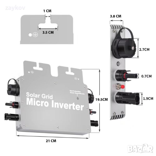 Микроинверторът е със защита IP65 и е безопасен за работа при -40°C до +60°C. Ако прегрее, автоматично намалява мощността. Дизайнът и монтажът са прости и гъвкави. Препоръчва се инсталиране под фотоволтаичните модули, за да се извършват сервизни дейности без проблеми.