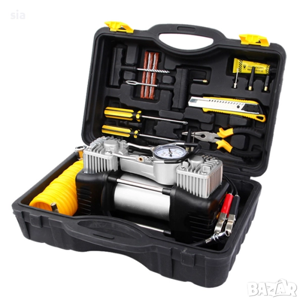 Двуцилиндров компресор с манометър+ инструменти, 12V, 55 л/мин.