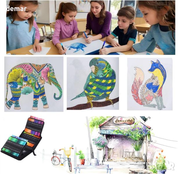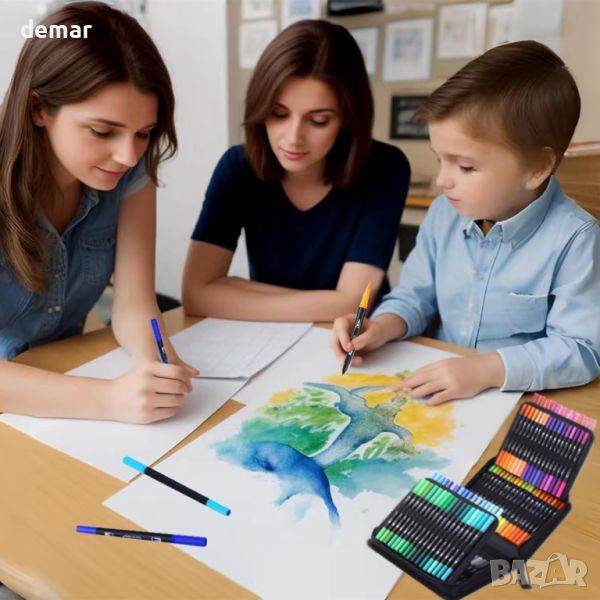 Този комплект флумастери с двоен връх разполага със 108 живи и различни цвята, с гъвкав връх на четка от 1-4 мм за оцветяване и засенчване и прецизен фин връх от 0,4 мм за очертаване и детайлна работа. Всяка писалка е проектирана с цветно кодирани капачки за лесно разпознаване. Писалките са направени от силни, нетоксични пигменти, които са бързо съхнещи и позволяват лесно напластяване и смесване без размазване. Те са подходящи за широк спектър от артистични приложения, включително манга, калиграфия, скициране и др. Този комплект е идеален подарък за различни поводи и е безопасен за използване с мастило на водна основа, което е без мирис. За издръжливост съхранявайте писалките плътно затворени на хладно и сухо място. Забележка: Не е подходящо за деца под 4 години поради малки части.