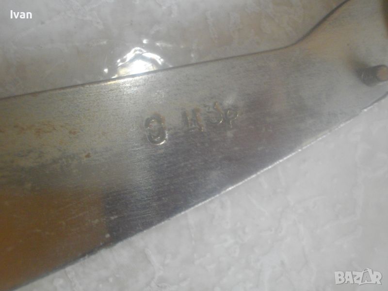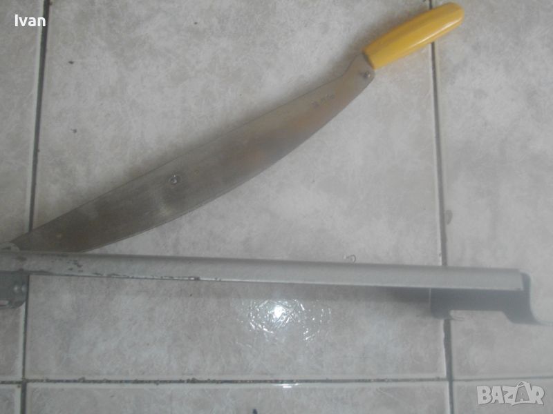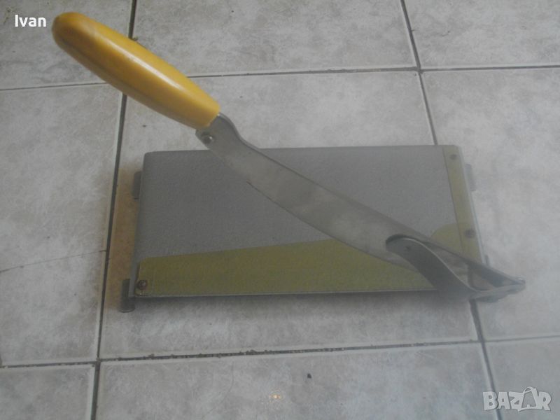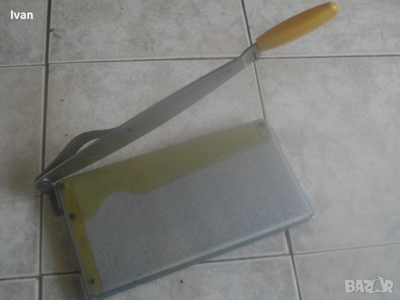 ОПИСАНИЕ на нова руска/СССР ръчна гилотина за рязане на хартия/хранителни продукти и други повърхности - цена 199 лв. Старо качество инструмеент, от стария материал, каквито в съвремието вече не се произвеждат. Дължина на ножа за срез - 300 мм/30 см. Дължина нож с дръжката - 400 мм, дръжка - твърда пластмаса. Острие - много остро, заточено фабрично. Гилотината е съвсем нова, неизползвана и неупотребявана. В отлично съсотяние. Основа - метална масивна, с хром боя. Размери основа 300х 150 мм. Дебелин на заточването на ножа - 3 мм. Маркировка на ножа - съветска Ц. 3 Р. Прозрачна ПВЦ подложка и ограничетел на плота за рязане на хартия. Тегло на гилотината - 1,2 кг. Цена 199 лв.