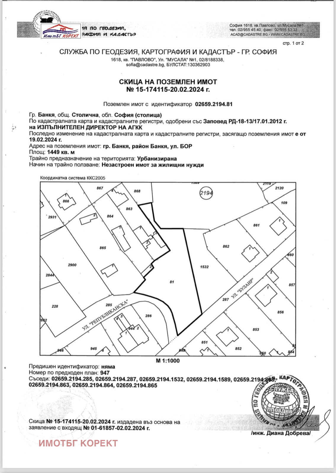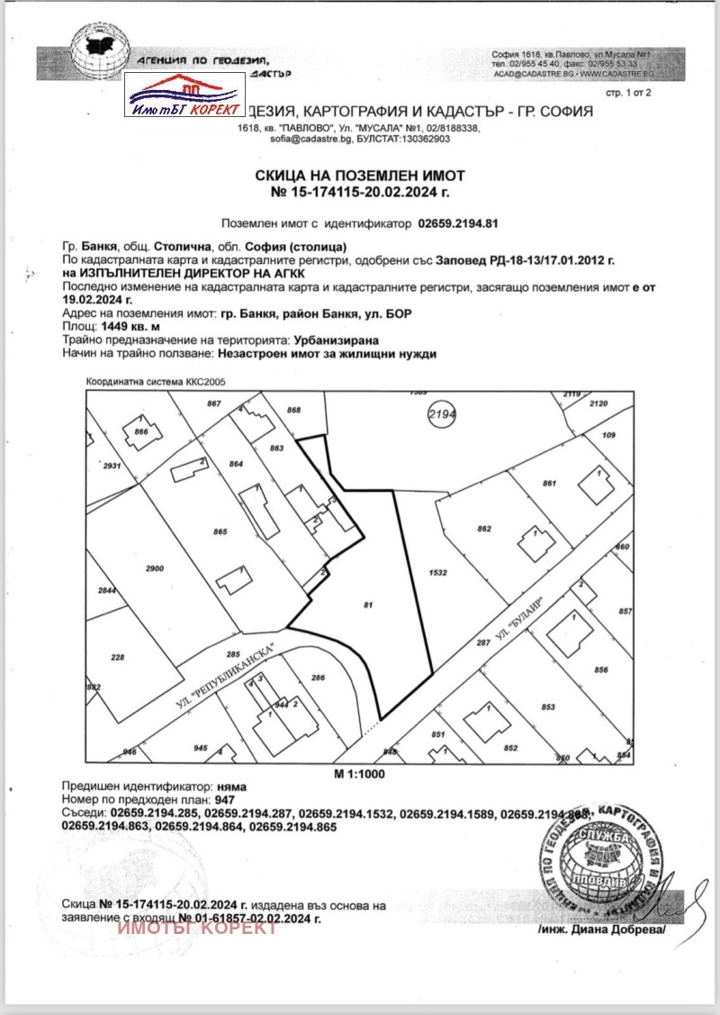 ***НОВА ОБЯВА*** Имот БГ. Корект предлага за продажба парцел в град Банкя, ул. 'Булаир'.