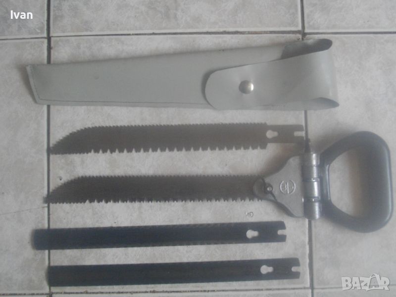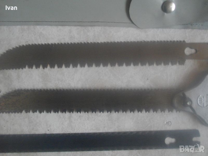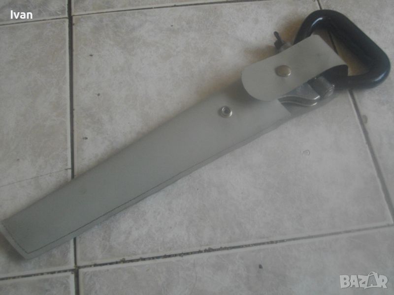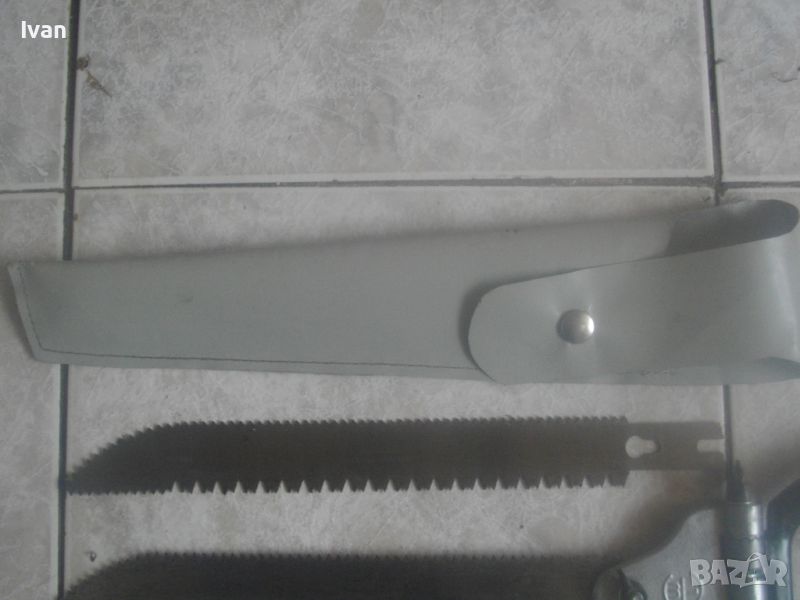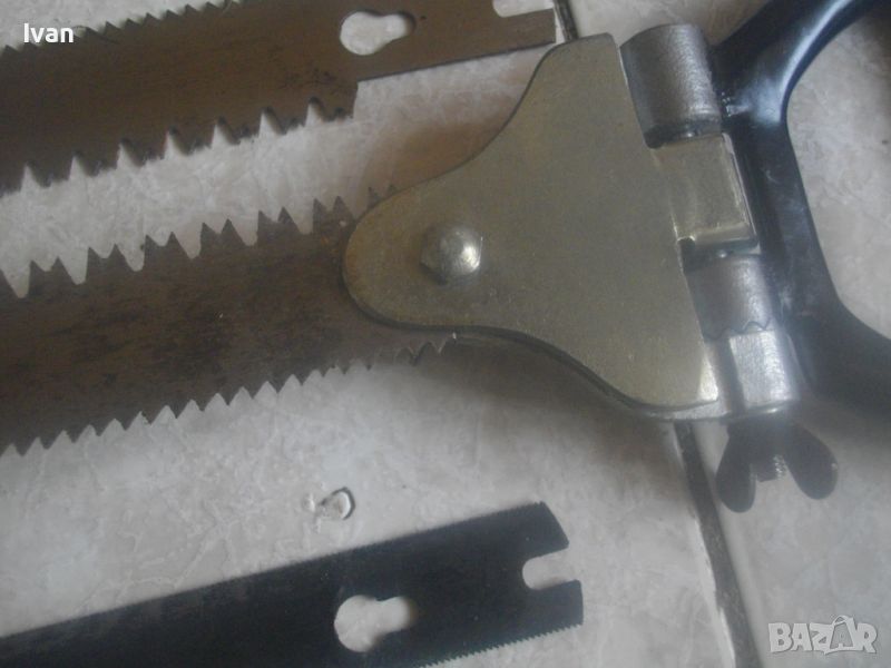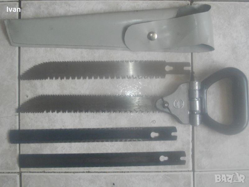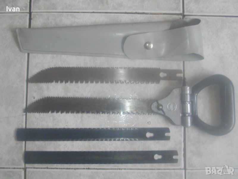 ОПИСАНИЕ на ръчен руски/СССР масивен трион ножовка с 4 сменяеми режещи дълги остриета - цена 199 лв. Почти нов, в отлично визуално и работно състояние. Масивна дръжка от тввръда пластмаса тип бекелит, масивна алуминиева глава за захват, захвателен болт за остриетата. Дължина триона с поставено острие - 400 мм.. Дължина на остриета режещи - 29 см - 30 см. 2 от остриетата са режещи триони за дърво със зъби от двете страни, големи чапраз и по-ситни прави. 2 бр. оостриета са ножовки от инструментална стомана от старото качество за рязане на желязо и цветни метали. Калъф на инструмента - оригинален от дебел найлон, плат и синтетична кожа, със закопчалка тик-так. Калъфа е като нов, без забележки. Маркировка на главата на триона - голямо лого съветско 1 m. Тегло на комплекта - 1,0 кг. Цена 199 лв.