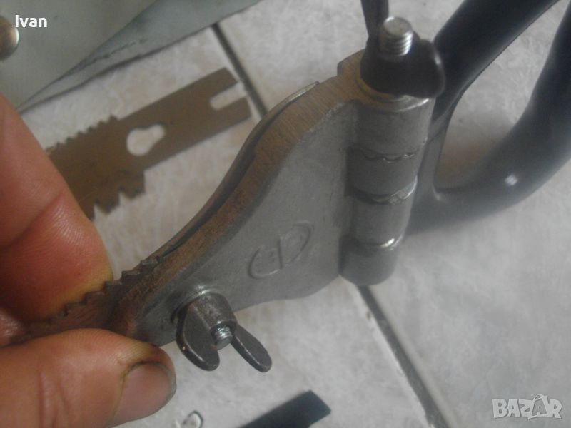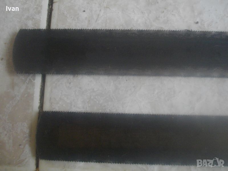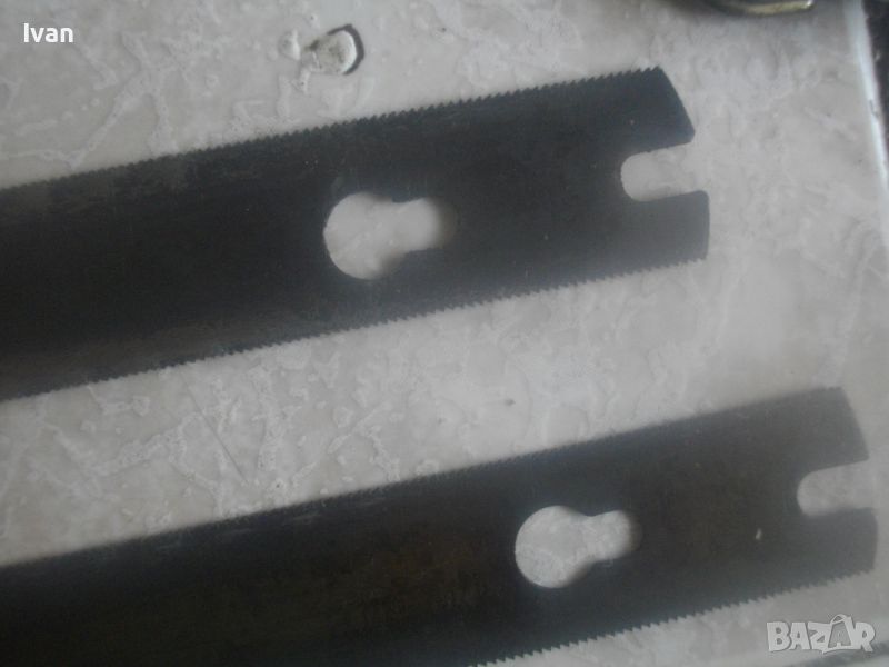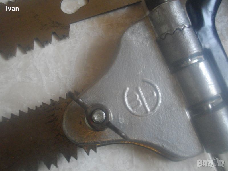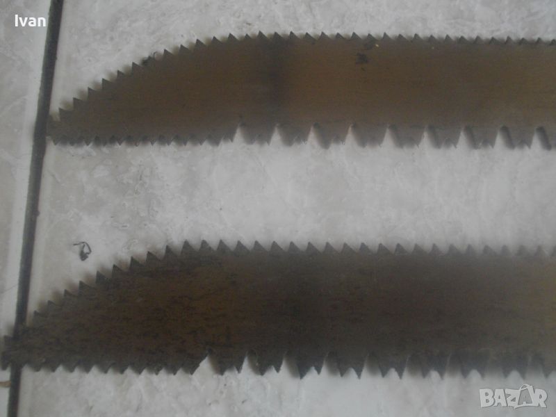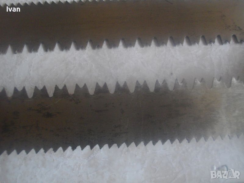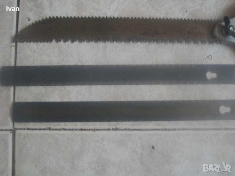 ОПИСАНИЕ на ръчен руски/СССР масивен трион ножовка с 4 сменяеми режещи дълги остриета - цена 199 лв. Почти нов, в отлично визуално и работно състояние. Масивна дръжка от тввръда пластмаса тип бекелит, масивна алуминиева глава за захват, захвателен болт за остриетата. Дължина триона с поставено острие - 400 мм.. Дължина на остриета режещи - 29 см - 30 см. 2 от остриетата са режещи триони за дърво със зъби от двете страни, големи чапраз и по-ситни прави. 2 бр. оостриета са ножовки от инструментална стомана от старото качество за рязане на желязо и цветни метали. Калъф на инструмента - оригинален от дебел найлон, плат и синтетична кожа, със закопчалка тик-так. Калъфа е като нов, без забележки. Маркировка на главата на триона - голямо лого съветско 1 m. Тегло на комплекта - 1,0 кг. Цена 199 лв.