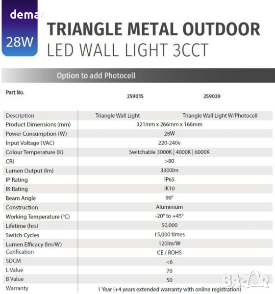 Bright Source Outdoor 28w вградена LED триъгълна метална стенна лампа, фотоклетка, IP65, 3300lm