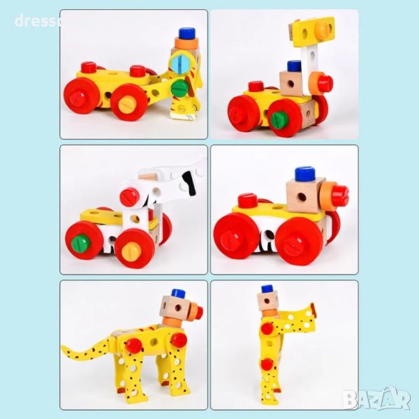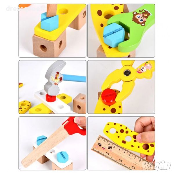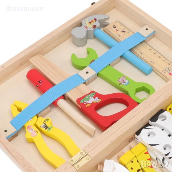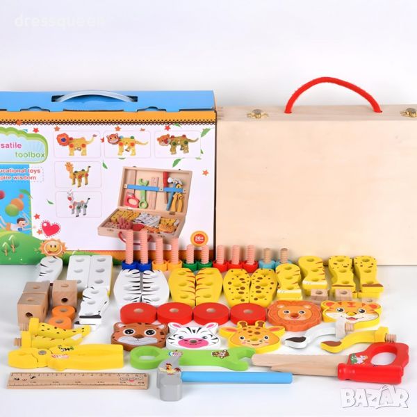 Дървено куфарче с дървени инструменти, болтове, части за животни - общо 52 части