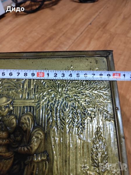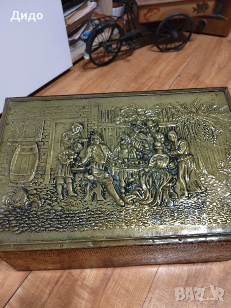 Стара и голяма дървена кутия с меден обков. Капакът от горната страна е релефен обков изобразяващ веселящи се хора в пивница. В много добро състояние.