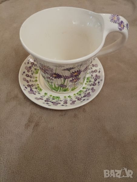 Саксия, кашпа в формата на чаша за кафе с чиния, украсена с маргаритки от две части. Отлично състояние, няма забележки.