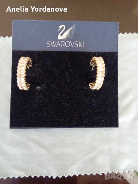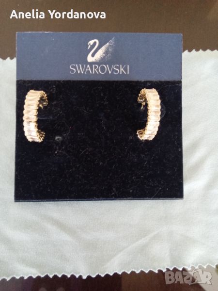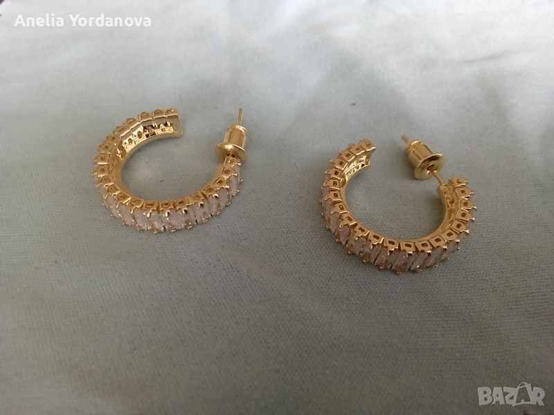 Предлагам нови обеци във форма на халки с бели правоъгълни камъни.