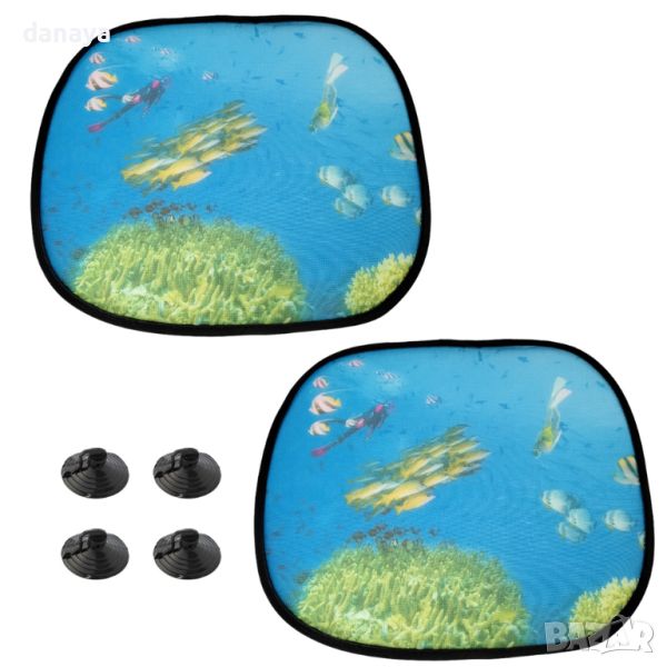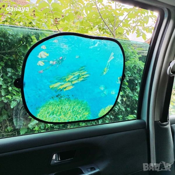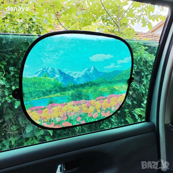 Комплект от 2 броя сенници за кола с принт на различни картини. Цветни сенници за странични стъкла на автомобил. Универсални саморазгъващи се сенници подходящи за всички превозни средства. Могат да се поставят както на предното странично стъкло, така и на задното. Закрепват се с помощта на вакуумки от вътрешната страна на прозореца. Защитават от слънцето и осигуряват комфорт при дълги пътувания.