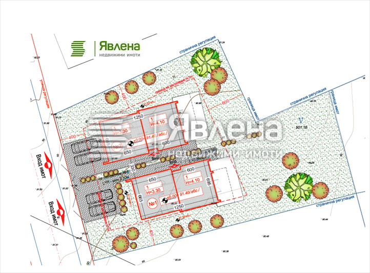 септична яма/. Застроената площ е 90кв.м и има следното разпределение: дневна с кухня и трапезария, две спални със самостоятелни бани, веранда пред дневната и две паркоместа в двора. Цялото дворно място е 1000кв.м, в което са разположени две еднакви къщи. Всяка къща се продава с 1/2 идеална част от двора. Има възможност за покупка само на едната къща за цена 84 000 евро. Ако се продават двете заедно, цената е 168 000 евро. Имотът има потенциал както за собствено ползване, така и за отдаване на туристи. (yavlenaCOM/143572).
