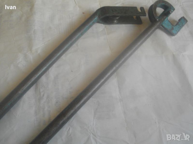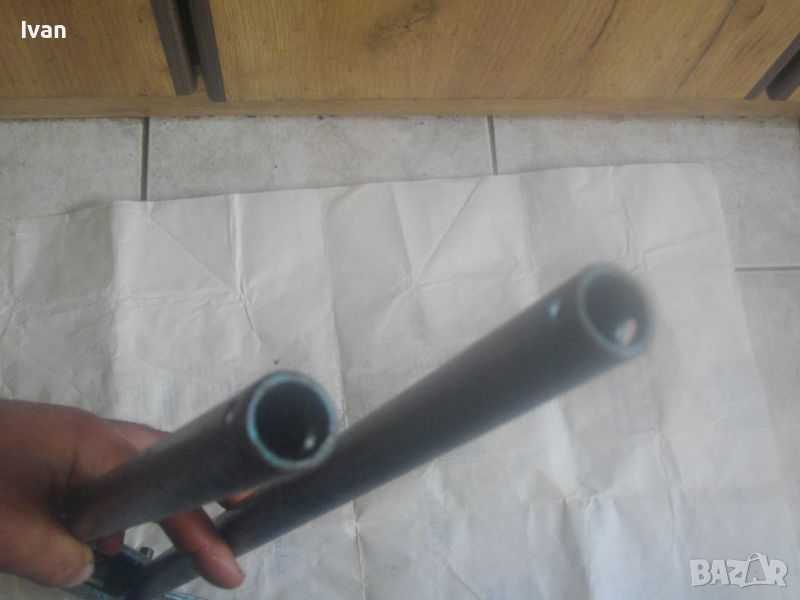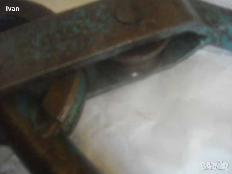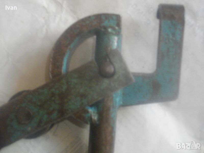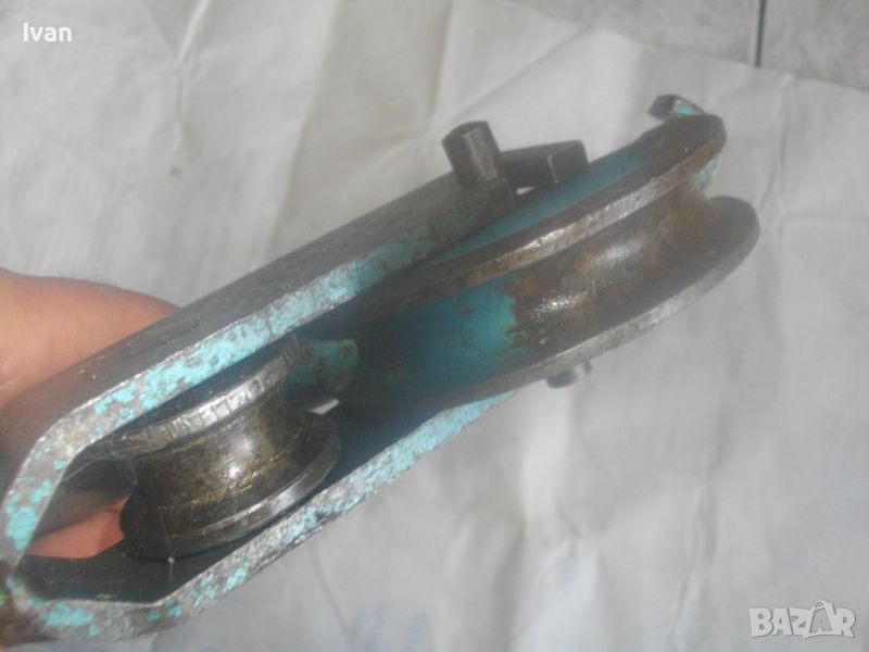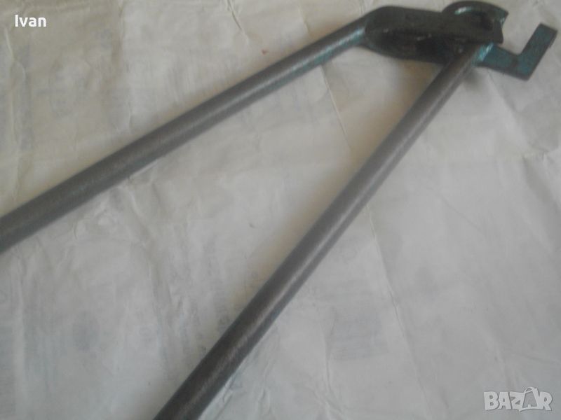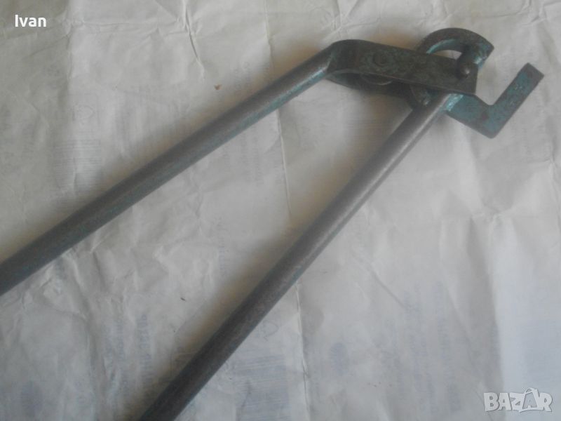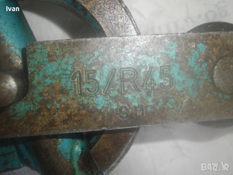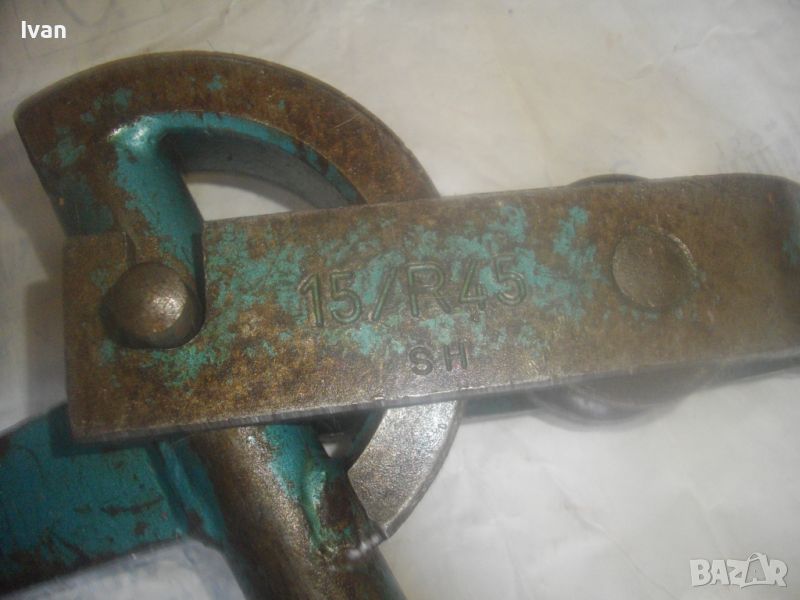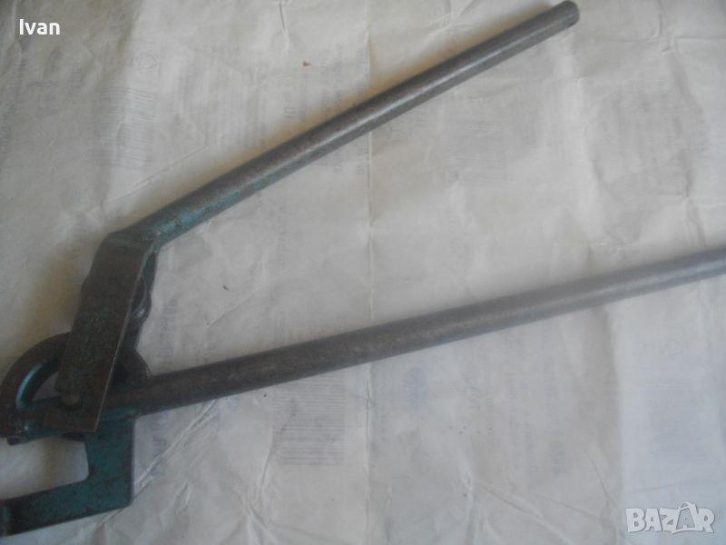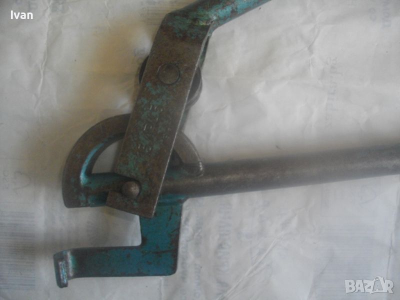Ползван масивен тръбогиб сиво-син - раземр огъване 15 мм - цена 199 лв. Немски проесионален, старо масивено ккачество. Типа тръбогиби масивни вече не се произвеждат в съвремието. За огъване на всякакви тръби, включитено и твърди дебелостенни метални. Дръжки дебели тръби ф 20 мм, глава метална масивна, без оразмеряване градуси, радиус огъване 45 мм. Маркировки - 15 mm - R 45 mm SH. Дължина 590 мм, ширина 180 мм, ролка кръгла масивна желязна огъвач, вграден метаен водач на главата. Тегло - 2,2 кг. Цена 199 лв.