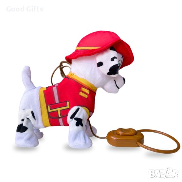 Това, което отличава тази играчка, е нейната способност да ходи до вашето дете. С едно просто натискане на бутон Маршал оживява, търчейки вярно до вас точно както прави в шоуто. Той ходи, танцува и свири оригиналния саундтрак, като лае и маха с опашка. Изведете го на разходка като вашия истински домашен любимец с меката плюшена каишка.